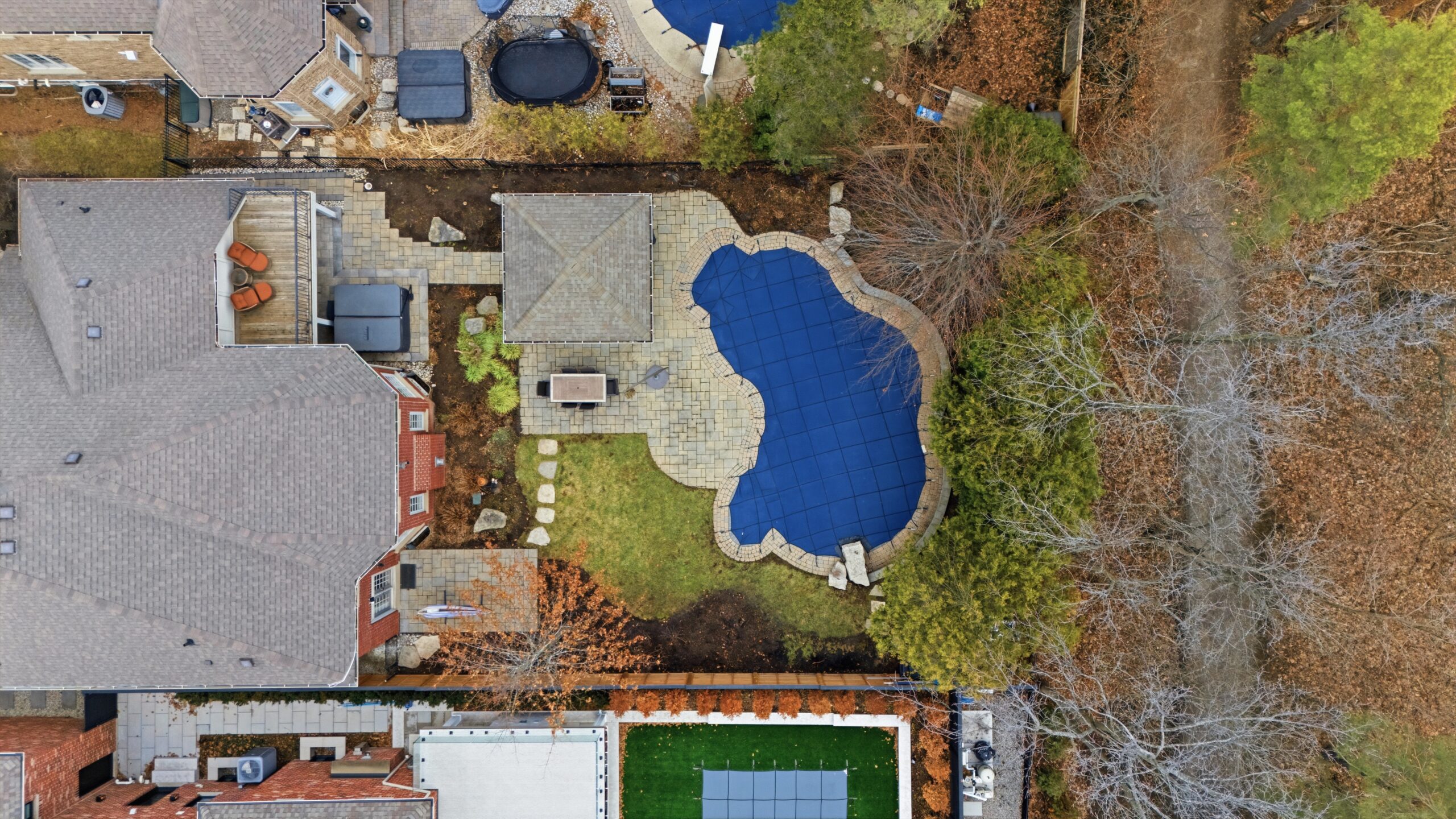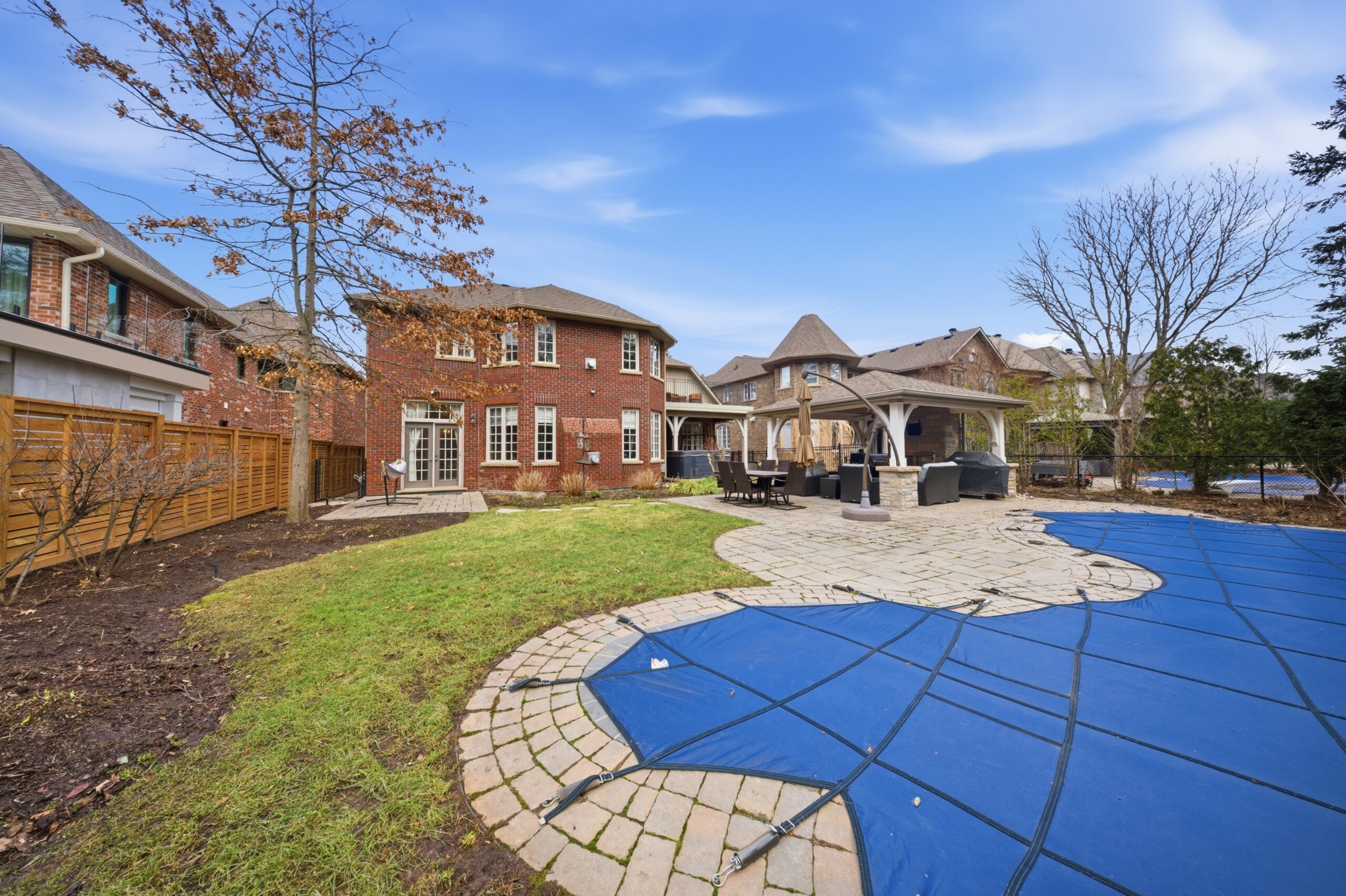 Outdoors, the experience continues with a resort-style backyard reminiscent of an upscale Muskoka setting — featuring an inground pool, hot tub, extensive stonework, and a covered cabana with a gas fireplace and outdoor TV, all set against a stunning forested backdrop. It is a space designed for long summer evenings, quiet mornings, and everything in between.