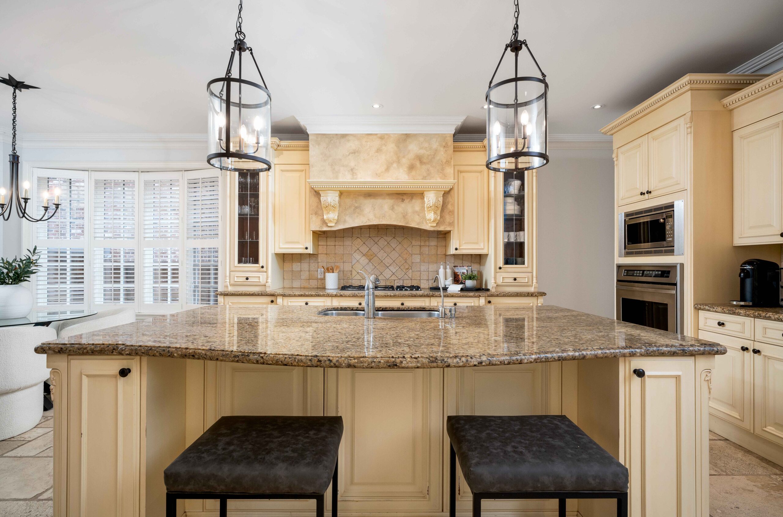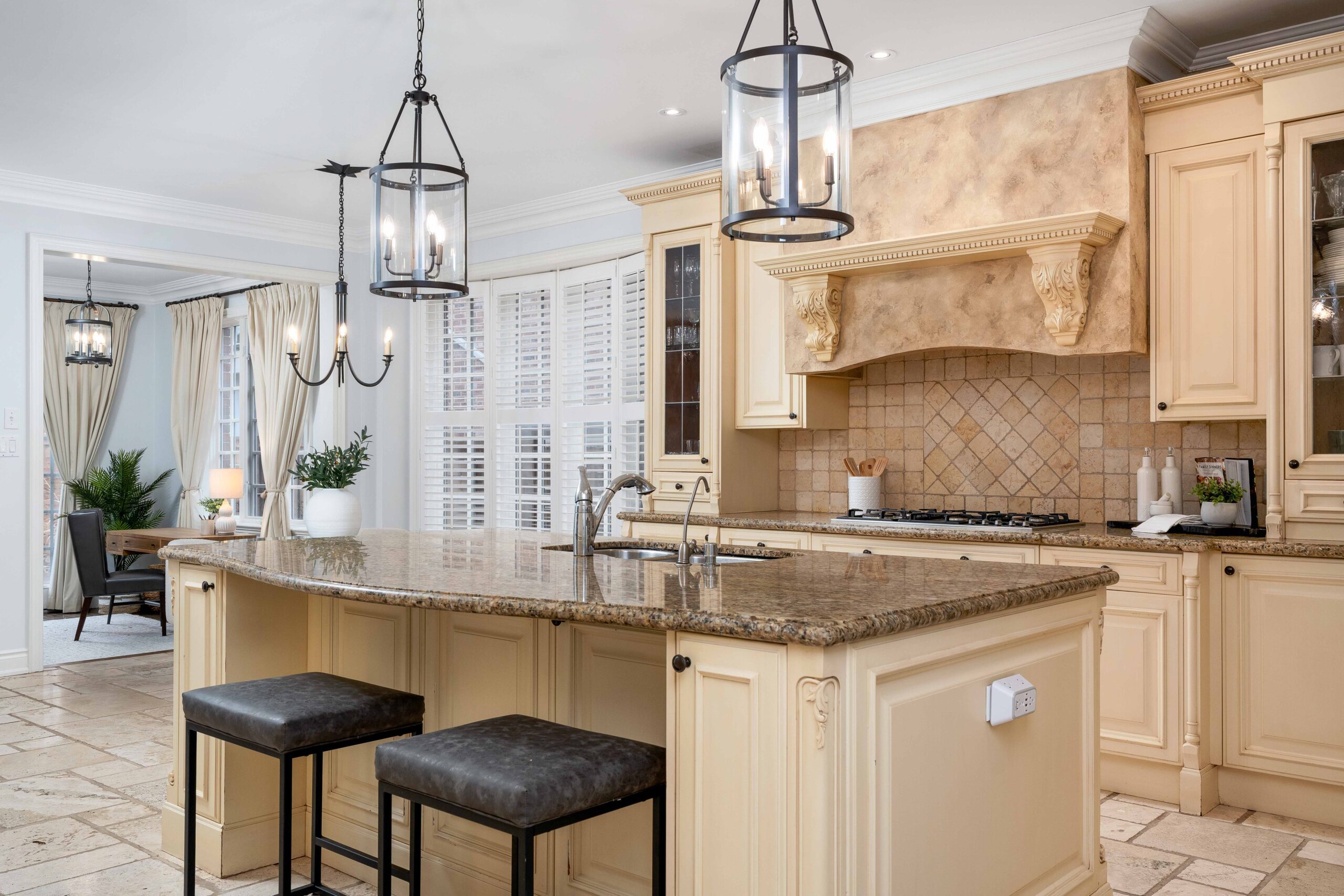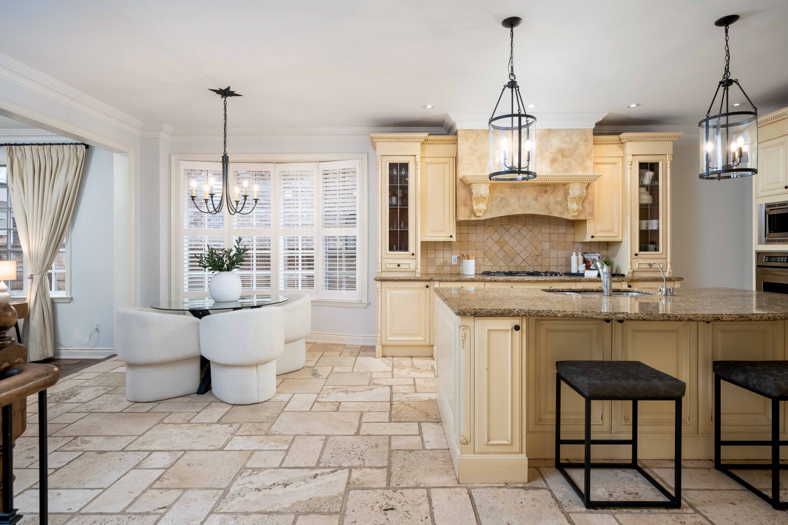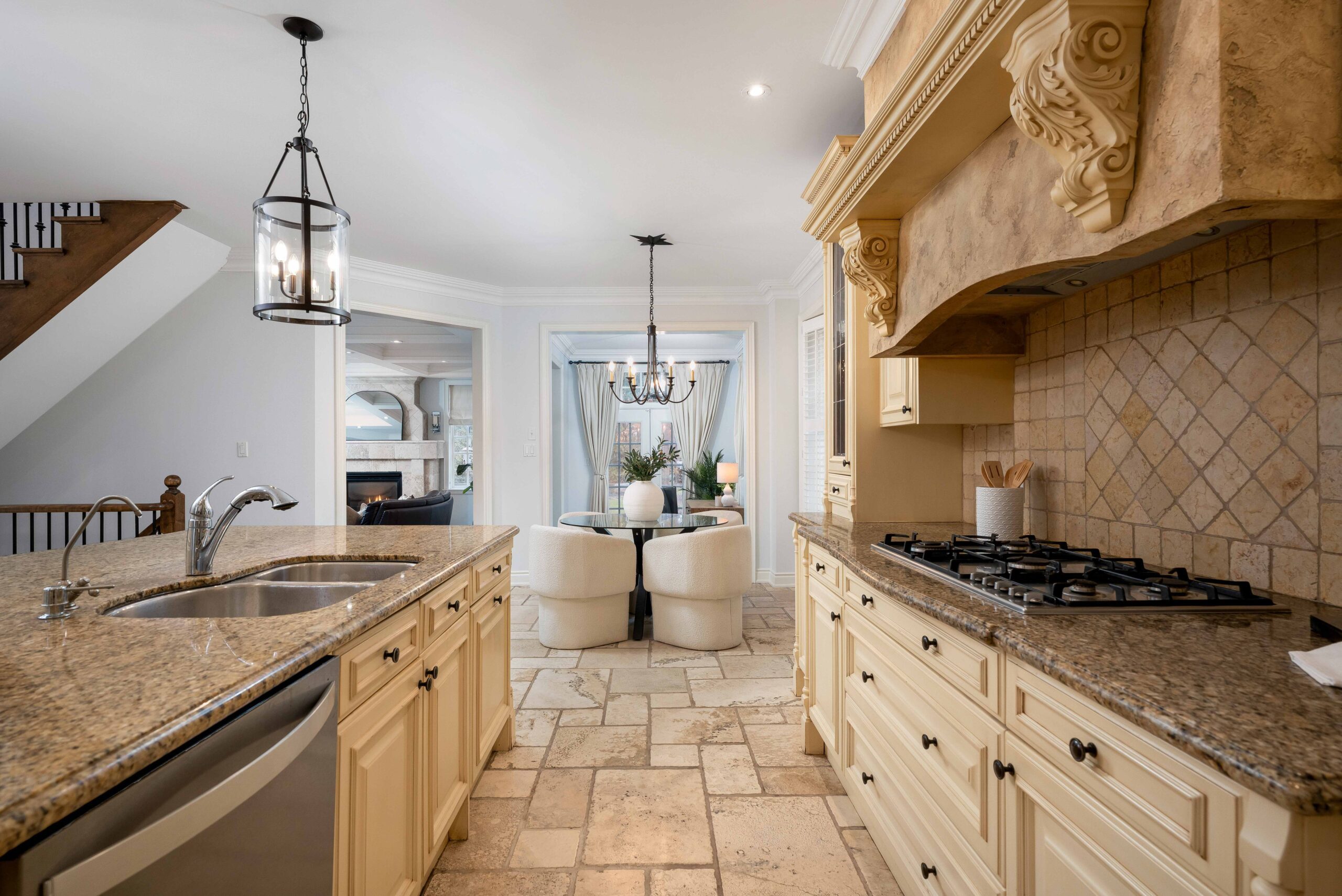 The kitchen is designed for both everyday living and entertaining, featuring custom cabinetry, generous prep space, granite and travertine surfaces, and a suite of upscale, professional grade appliances including a gas range. It opens to a bright breakfast area and a spacious den with a second walk-out, creating a natural connection across the main living spaces. A separate dining room, accessed through a breezeway, provides an elegant setting for hosting.