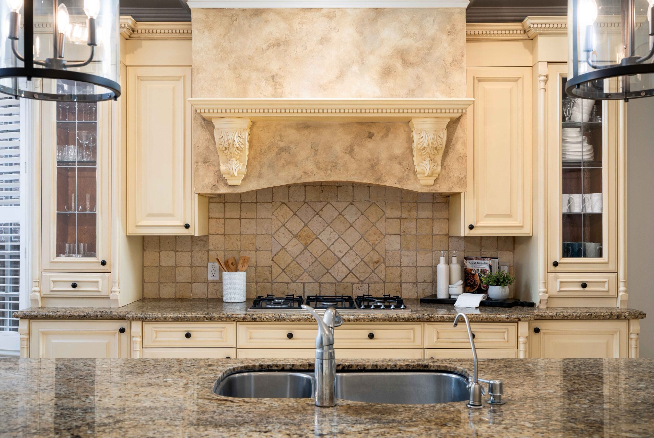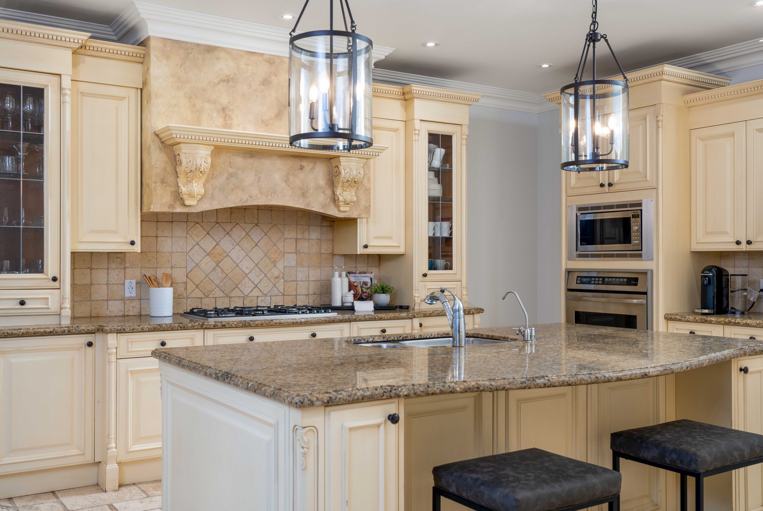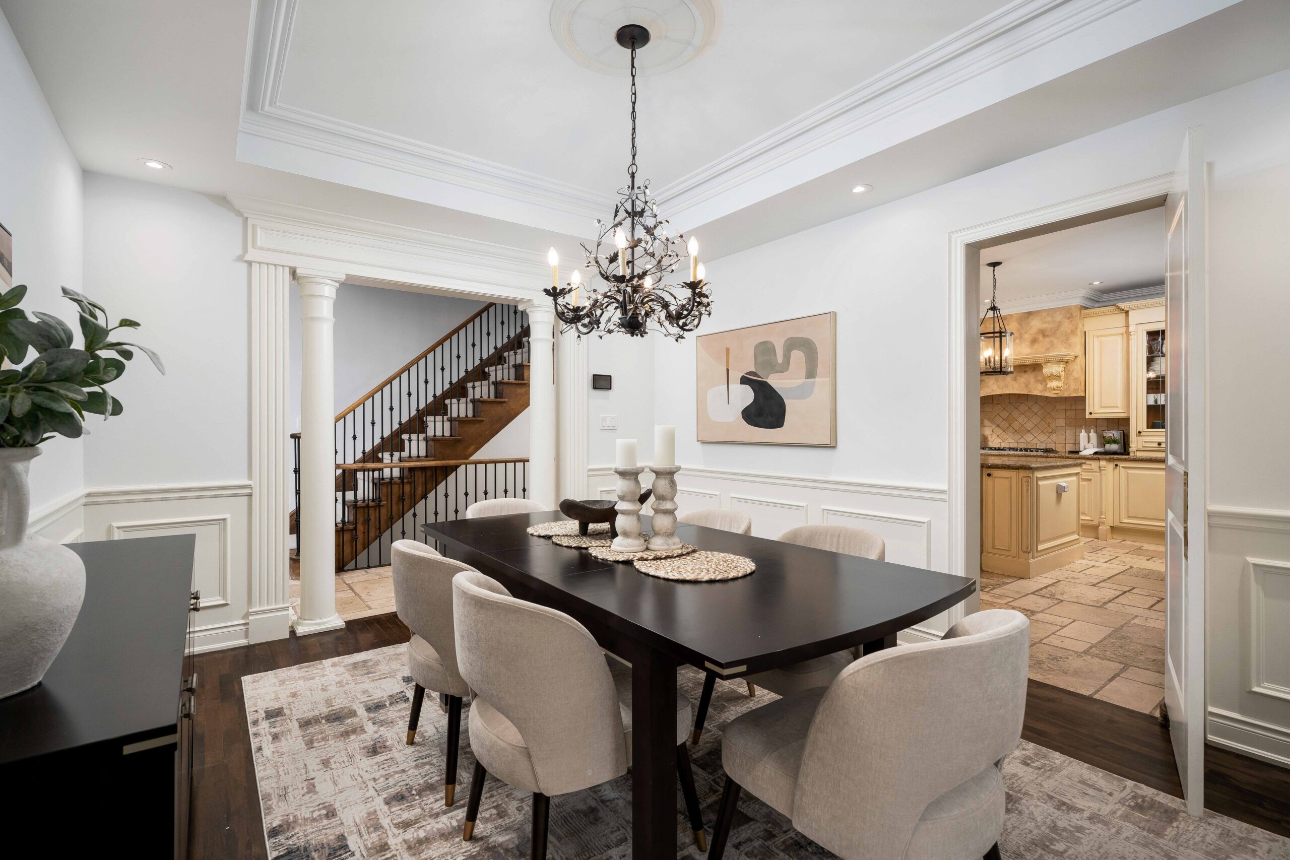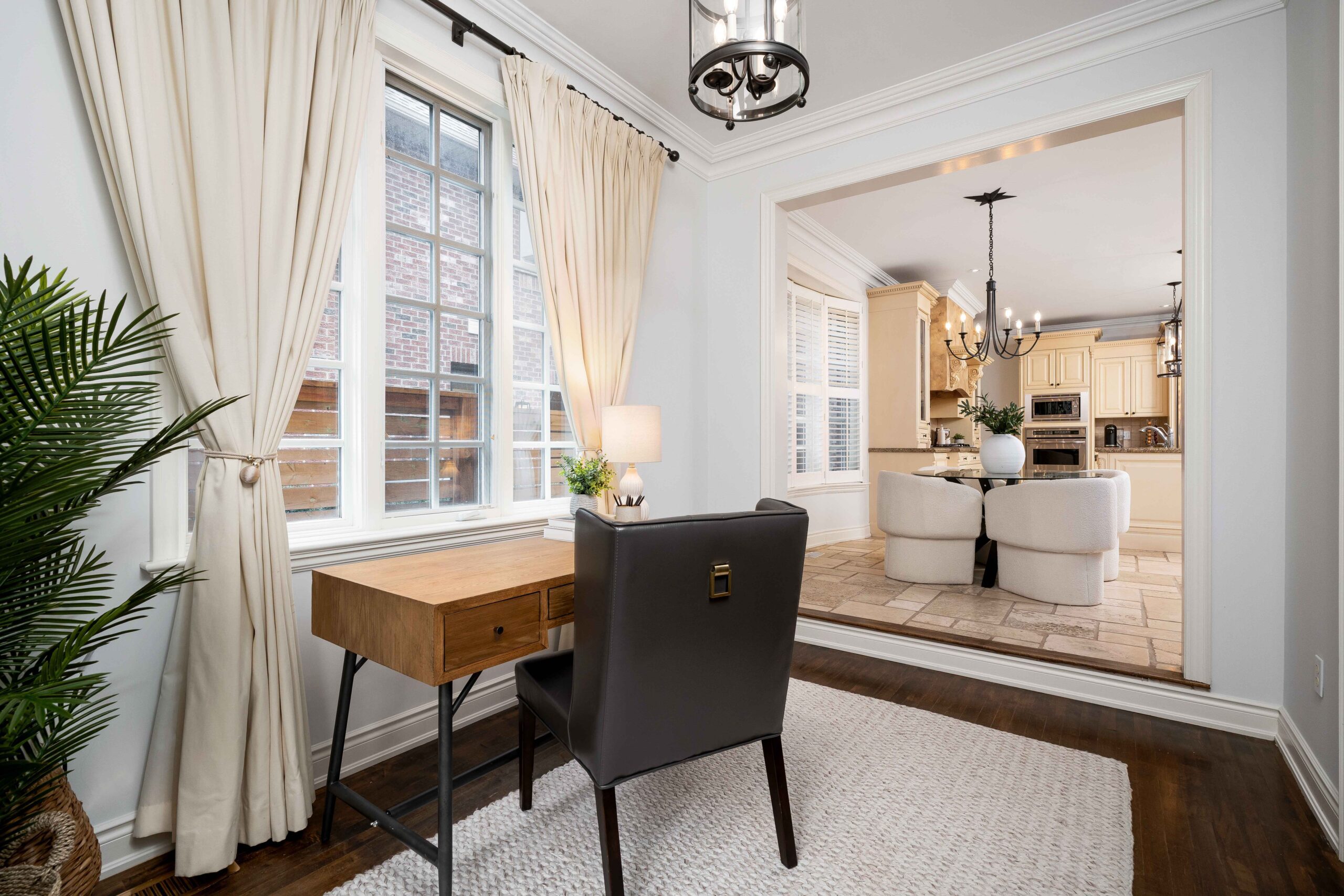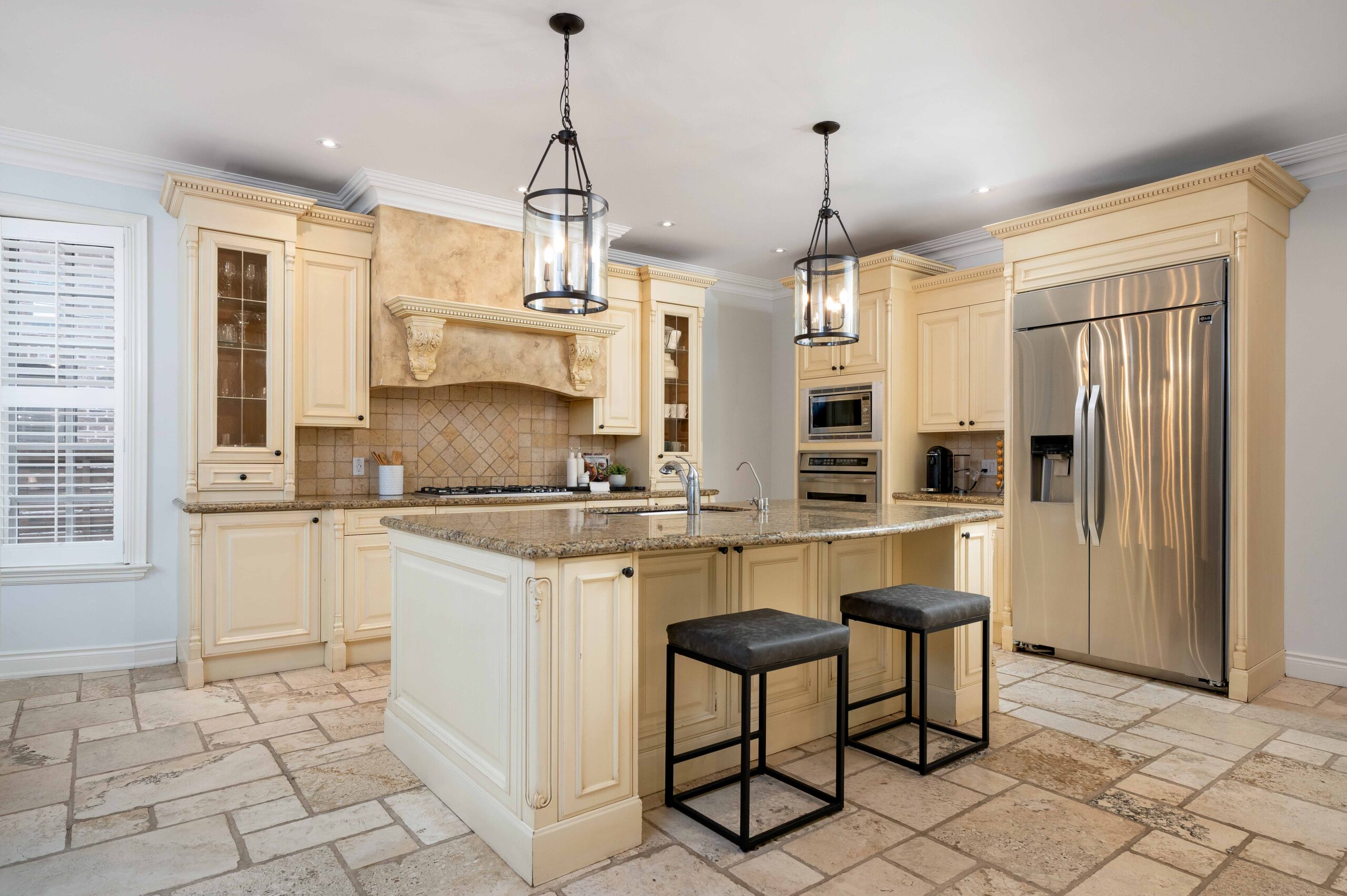 The kitchen is designed for both everyday living and entertaining, featuring custom cabinetry, generous prep space, granite and travertine surfaces, and a suite of upscale, professional grade appliances including a gas range. It opens to a bright breakfast area and a spacious den with a second walk-out, creating a natural connection across the main living spaces. A separate dining room, accessed through a breezeway, provides an elegant setting for hosting.
