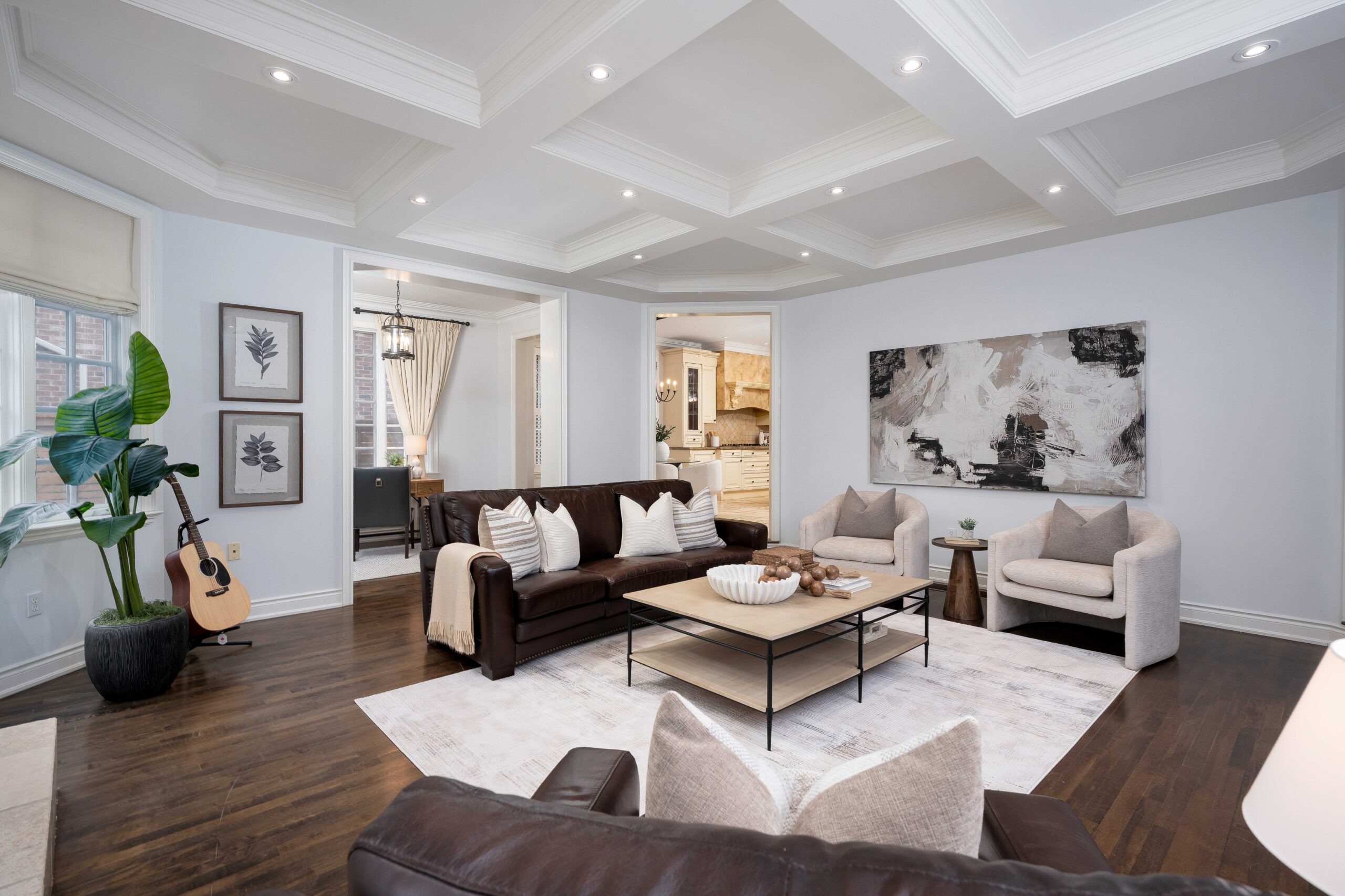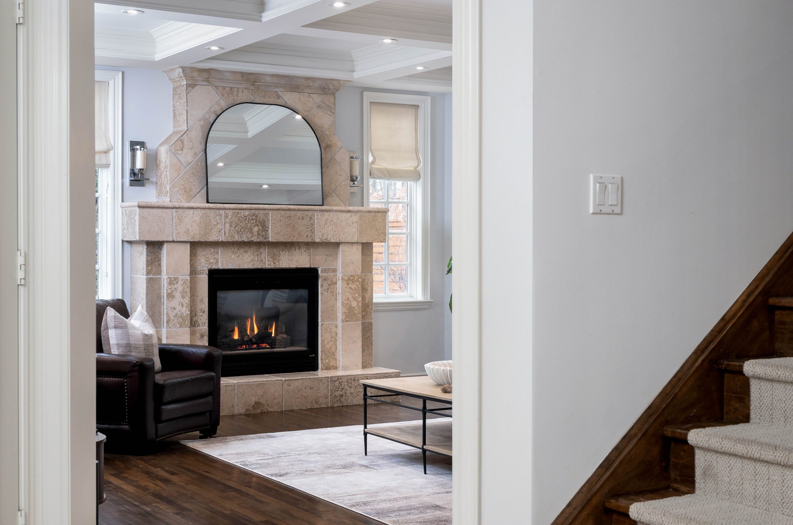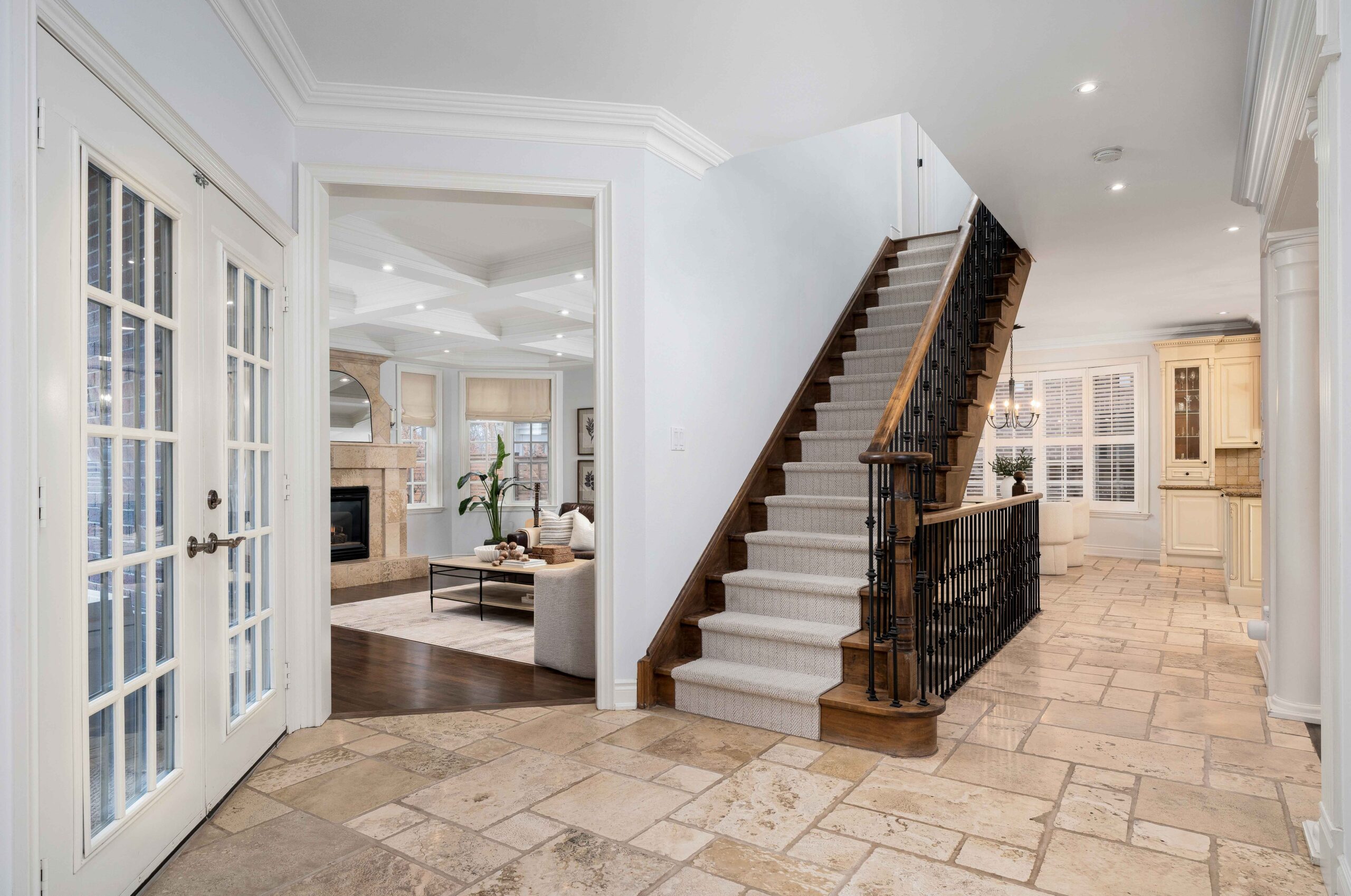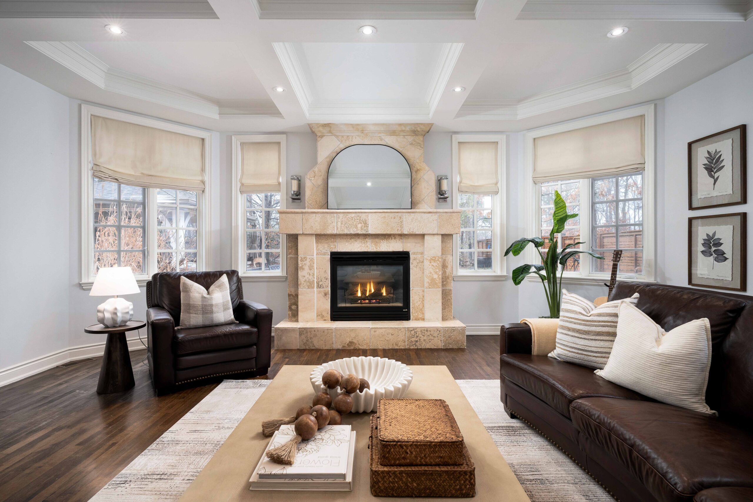 Inside, a grand yet welcoming interior unfolds with 9-foot smooth ceilings, rich hardwood and travertine floors, custom millwork, and expansive windows that frame views of the surrounding greenery. The formal living room, complete with custom built-ins and a coffered ceiling, offers a quiet place to unwind, while the nearly 20 x 20 ft great room is both impressive and inviting — anchored by a dramatic floor-to-ceiling stone fireplace and a striking waffle ceiling.
