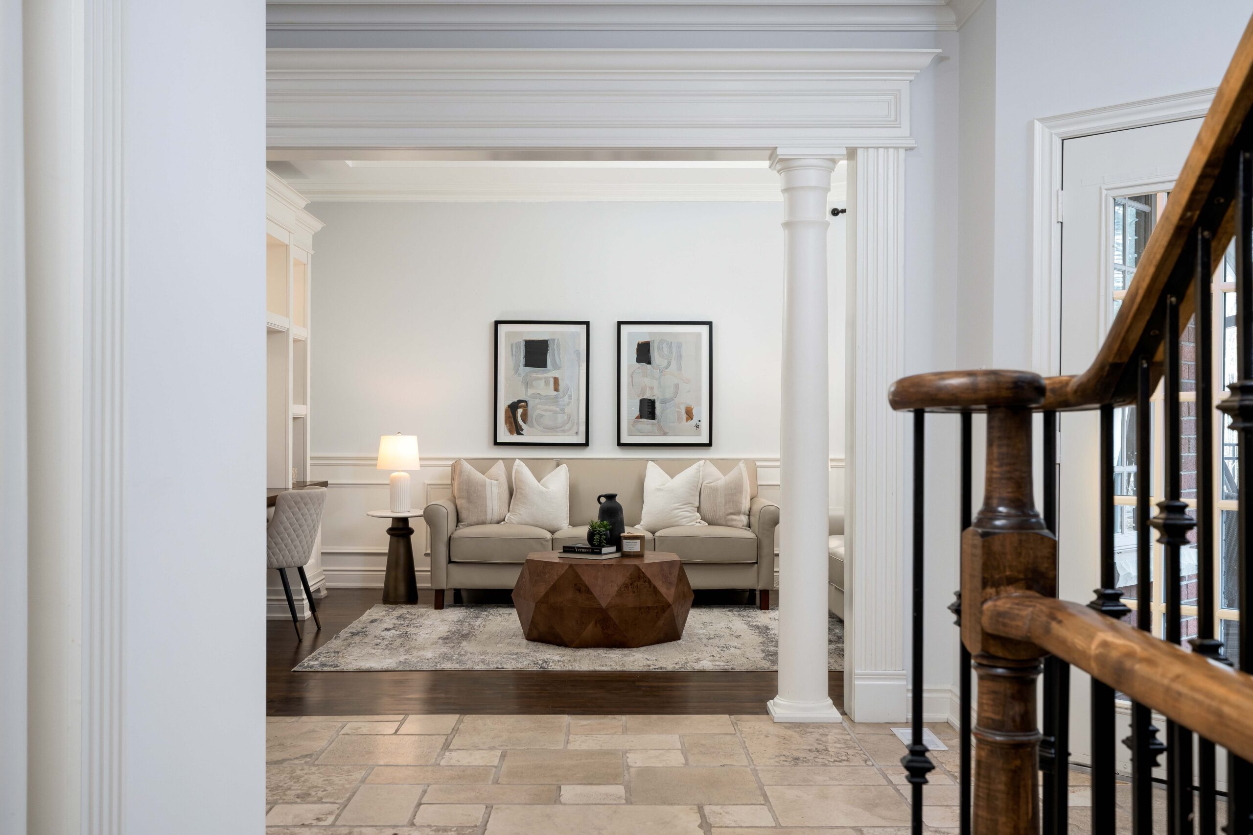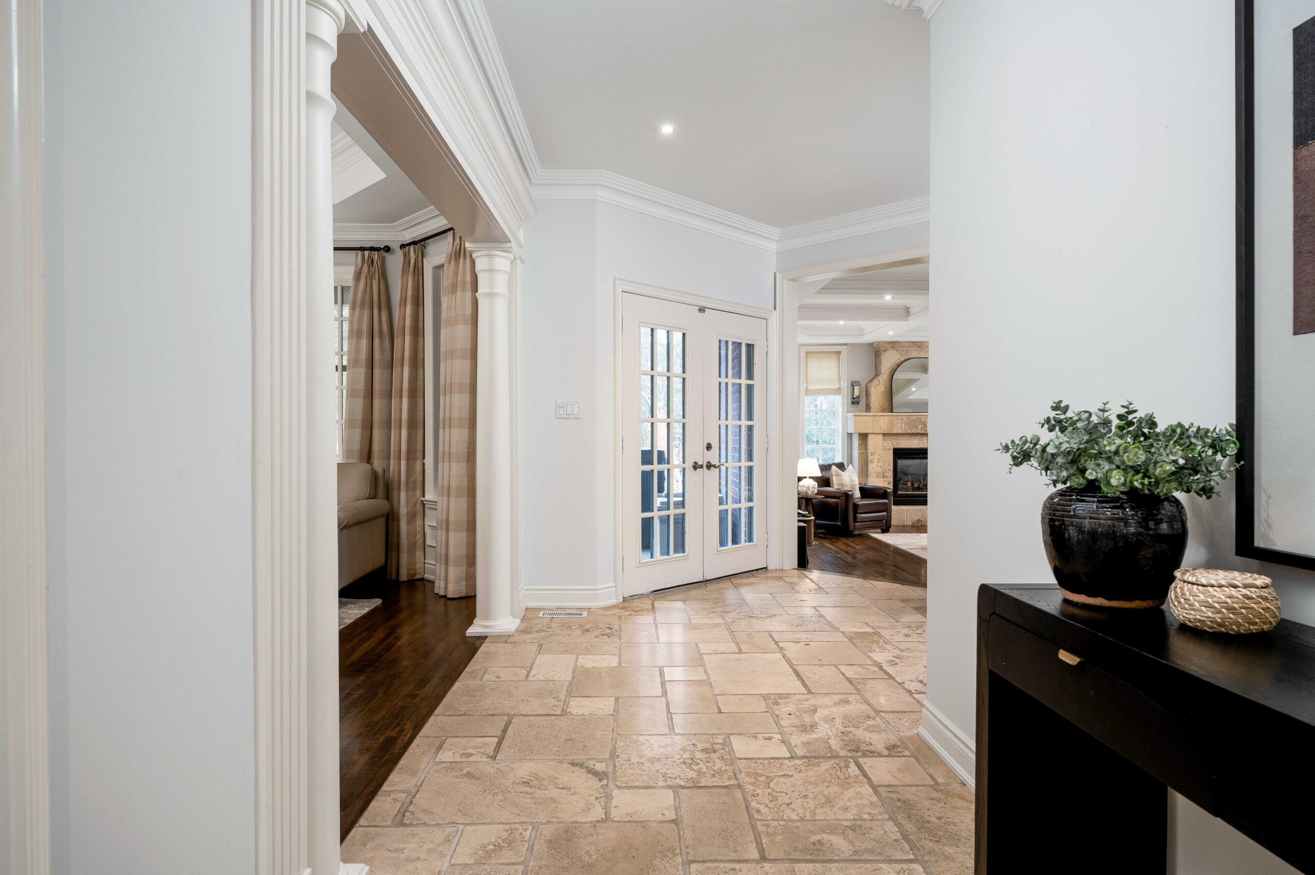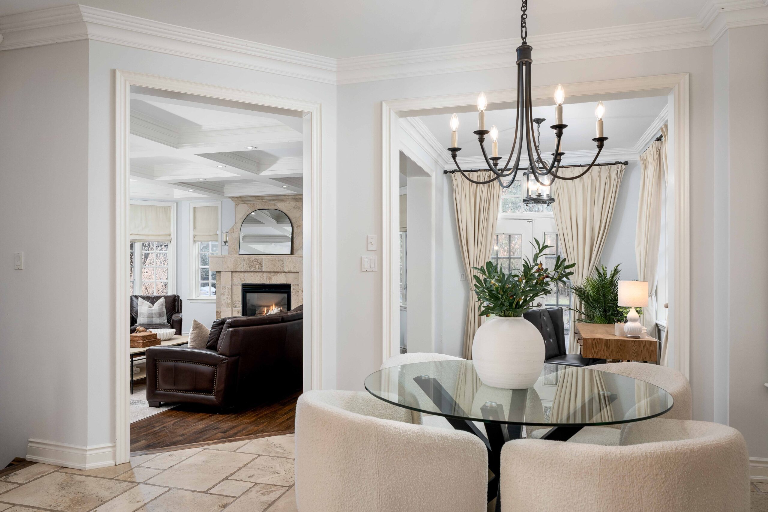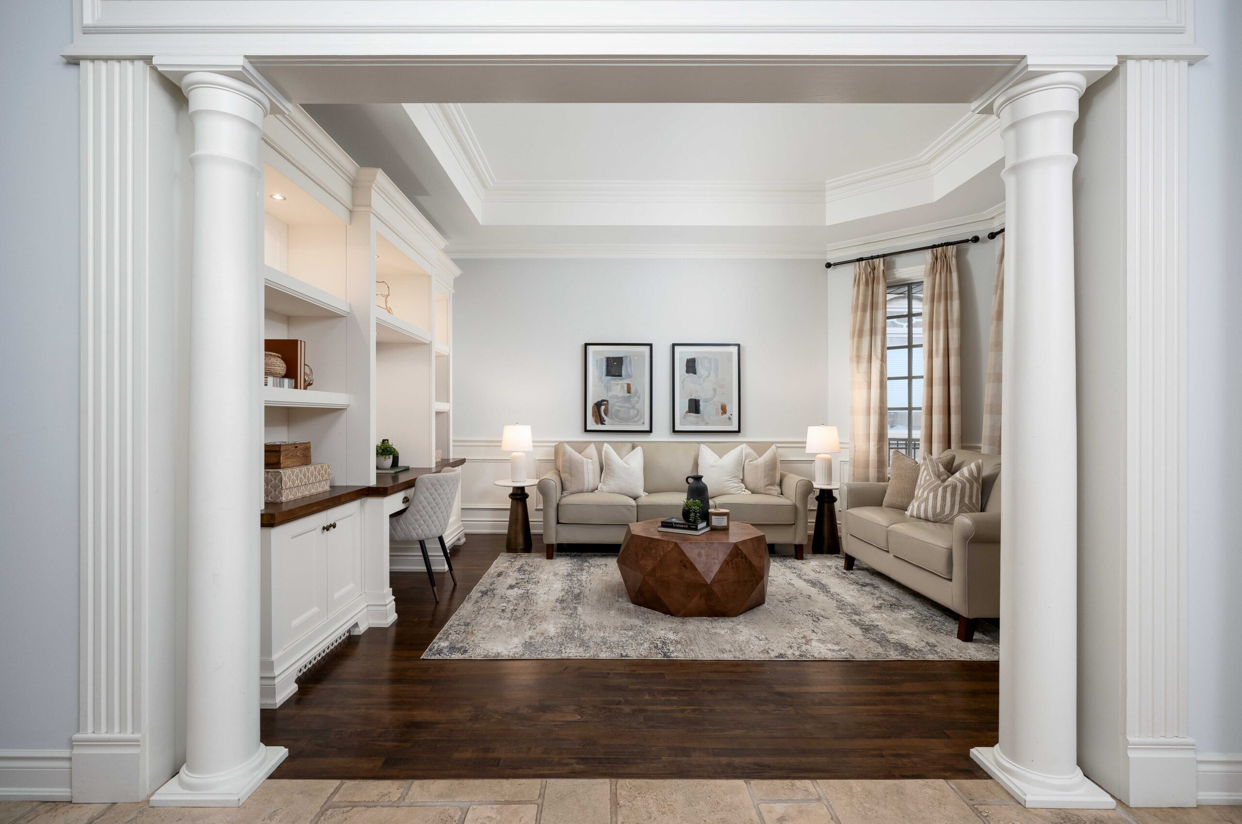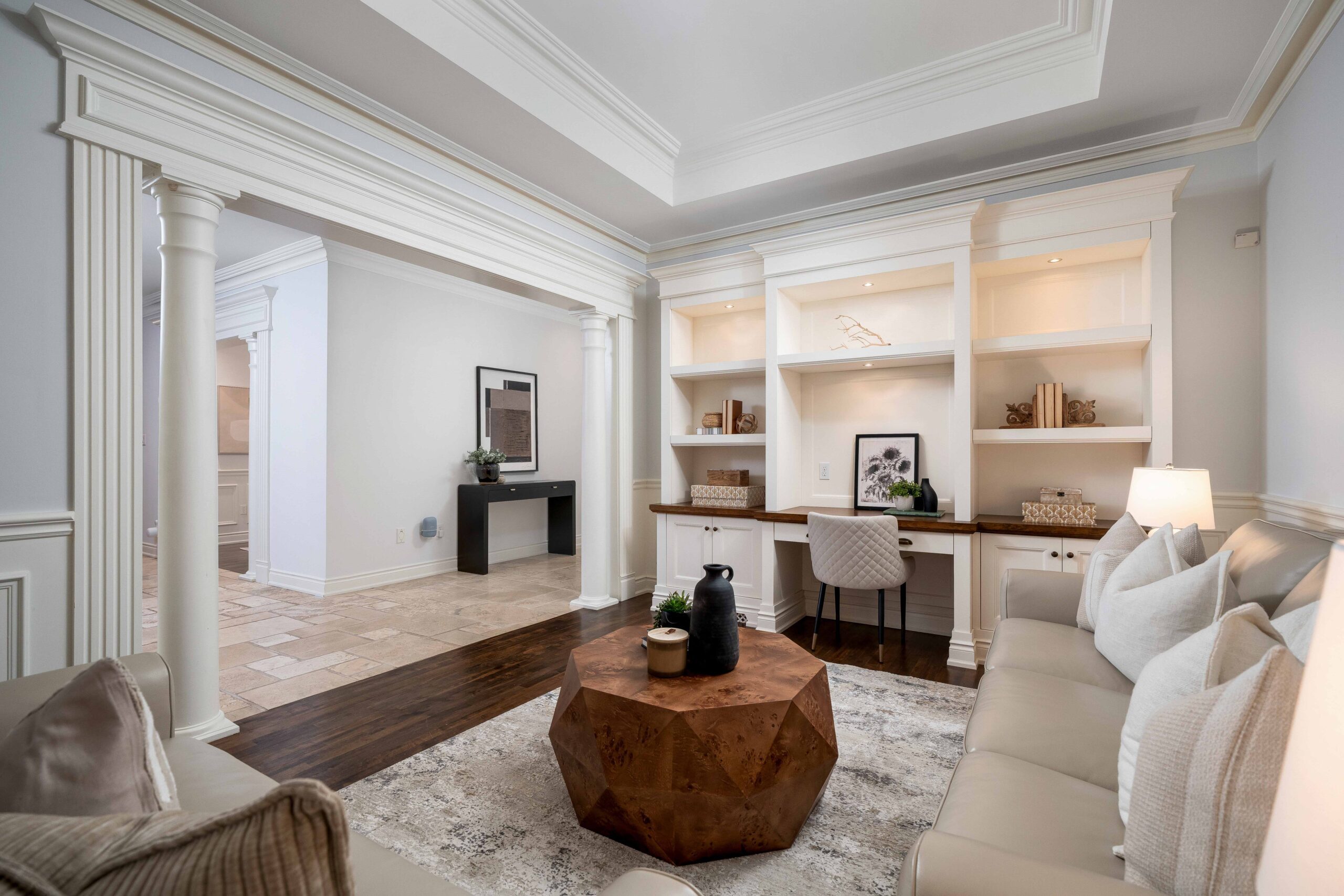 Inside, a grand yet welcoming interior unfolds with 9-foot smooth ceilings, rich hardwood and travertine floors, custom millwork, and expansive windows that frame views of the surrounding greenery. The formal living room, complete with custom built-ins and a coffered ceiling, offers a quiet place to unwind, while the nearly 20 x 20 ft great room is both impressive and inviting — anchored by a dramatic floor-to-ceiling stone fireplace and a striking waffle ceiling.