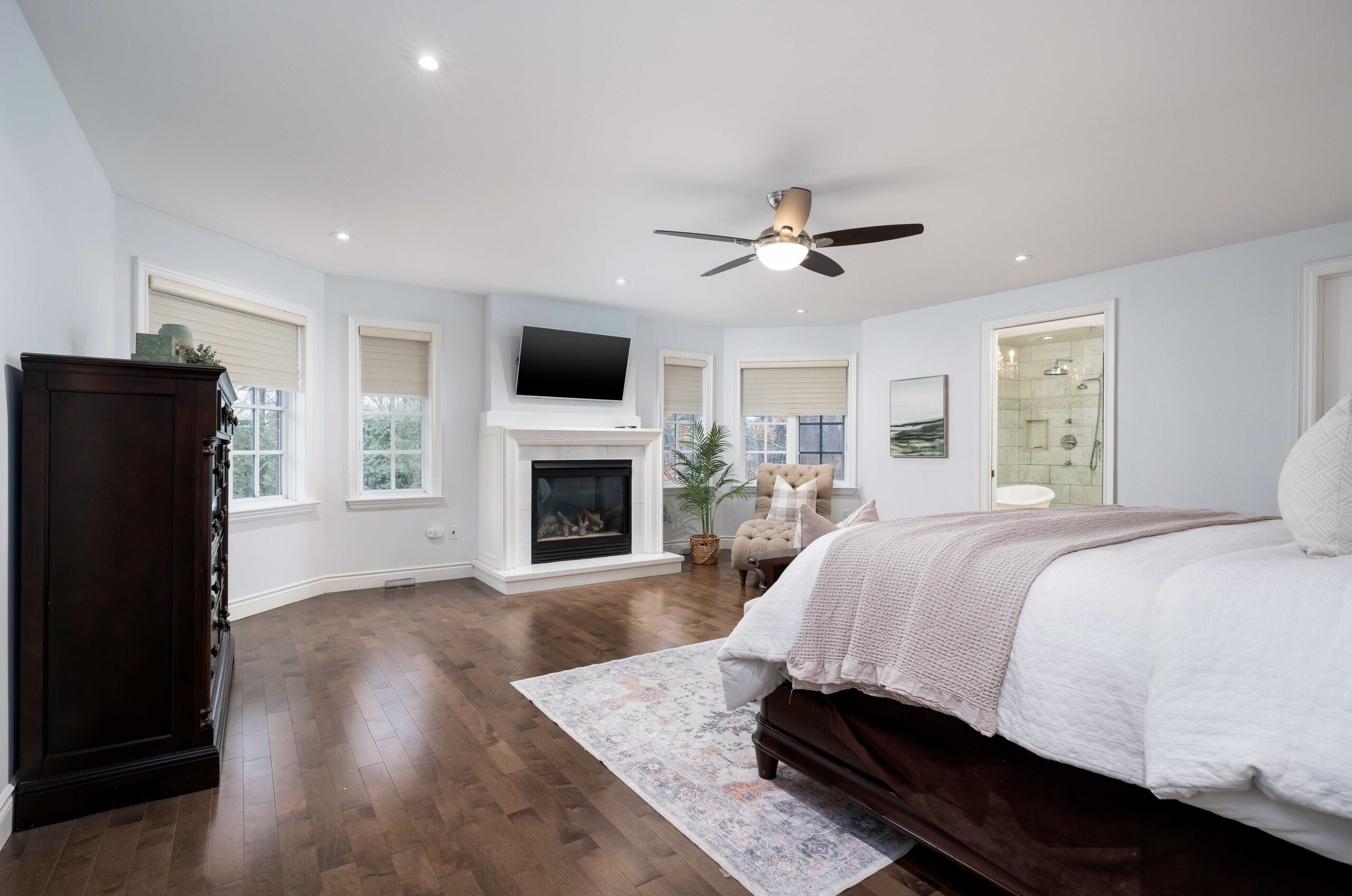 Upstairs, four generously sized bedrooms each enjoy ensuite access. The primary suite is a private retreat at approximately 20 x 19 feet, complete with a gas fireplace, sitting area, two walk-in closets, and a walk-out to a balcony overlooking the ravine. The gorgeous spa-inspired ensuite is finished in marble with a frameless glass shower, freestanding soaker tub, and separate water closet.