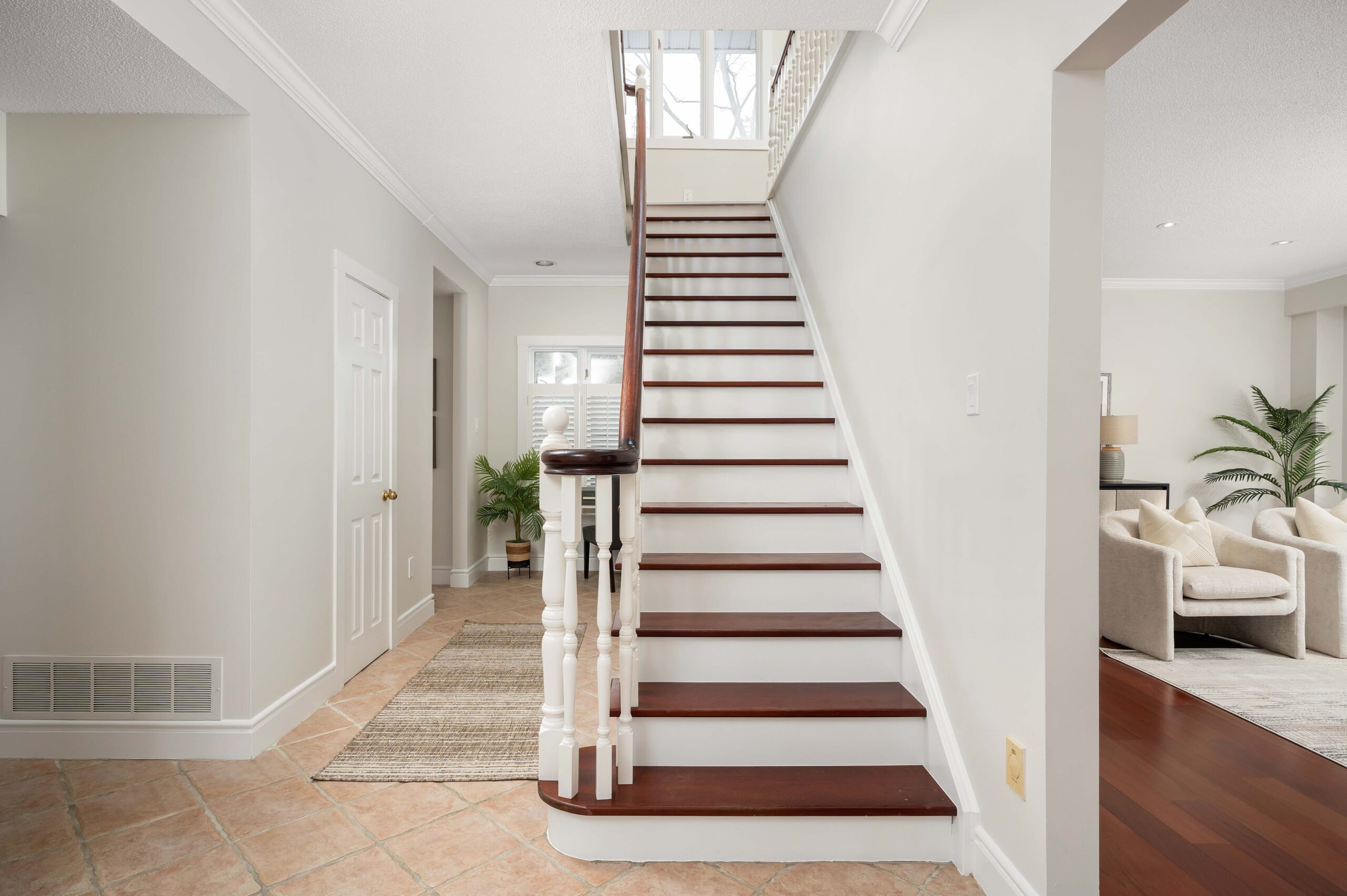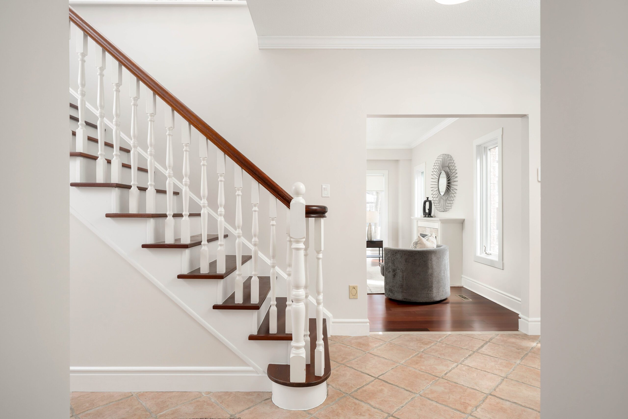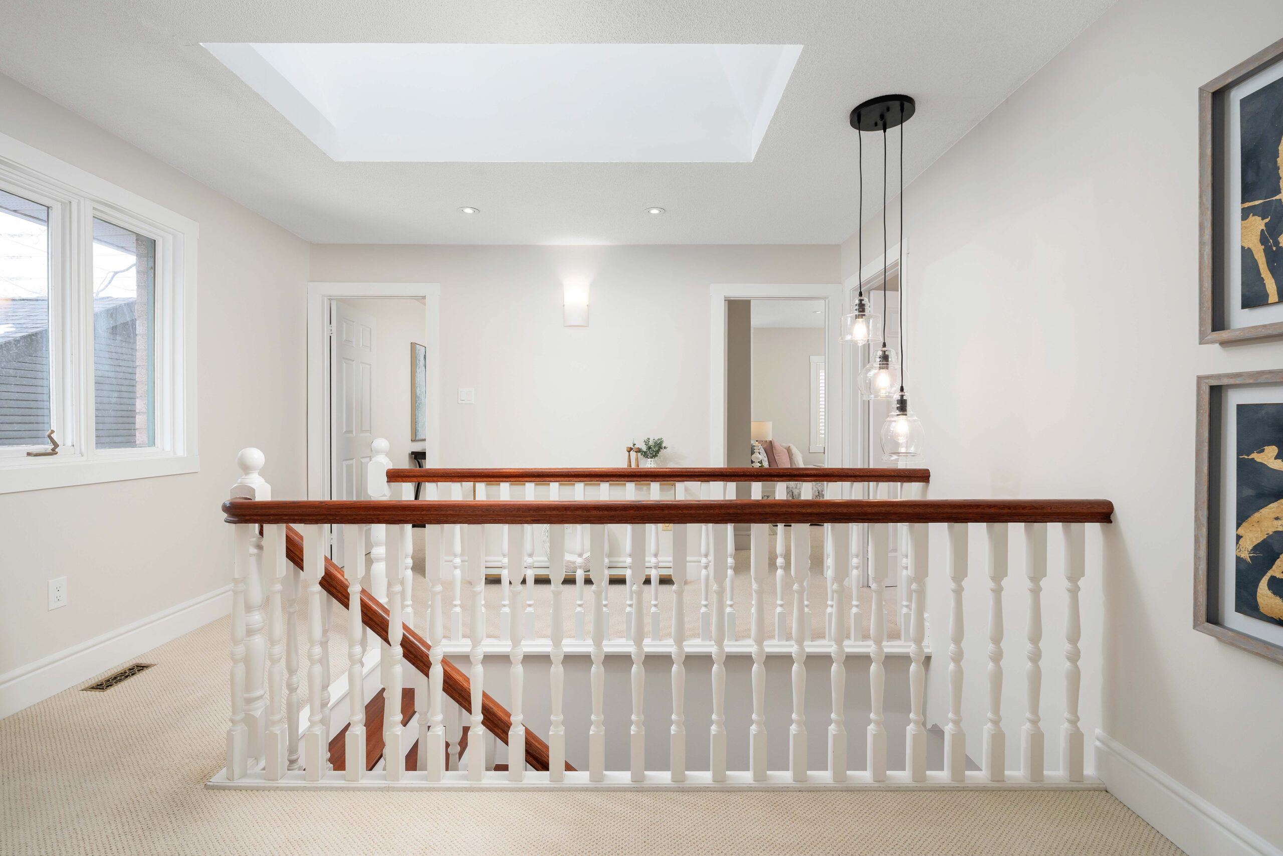 - Beautiful hardwood staircase with white pickets and risers leads to a sunlight landing with a large skylight on the second level