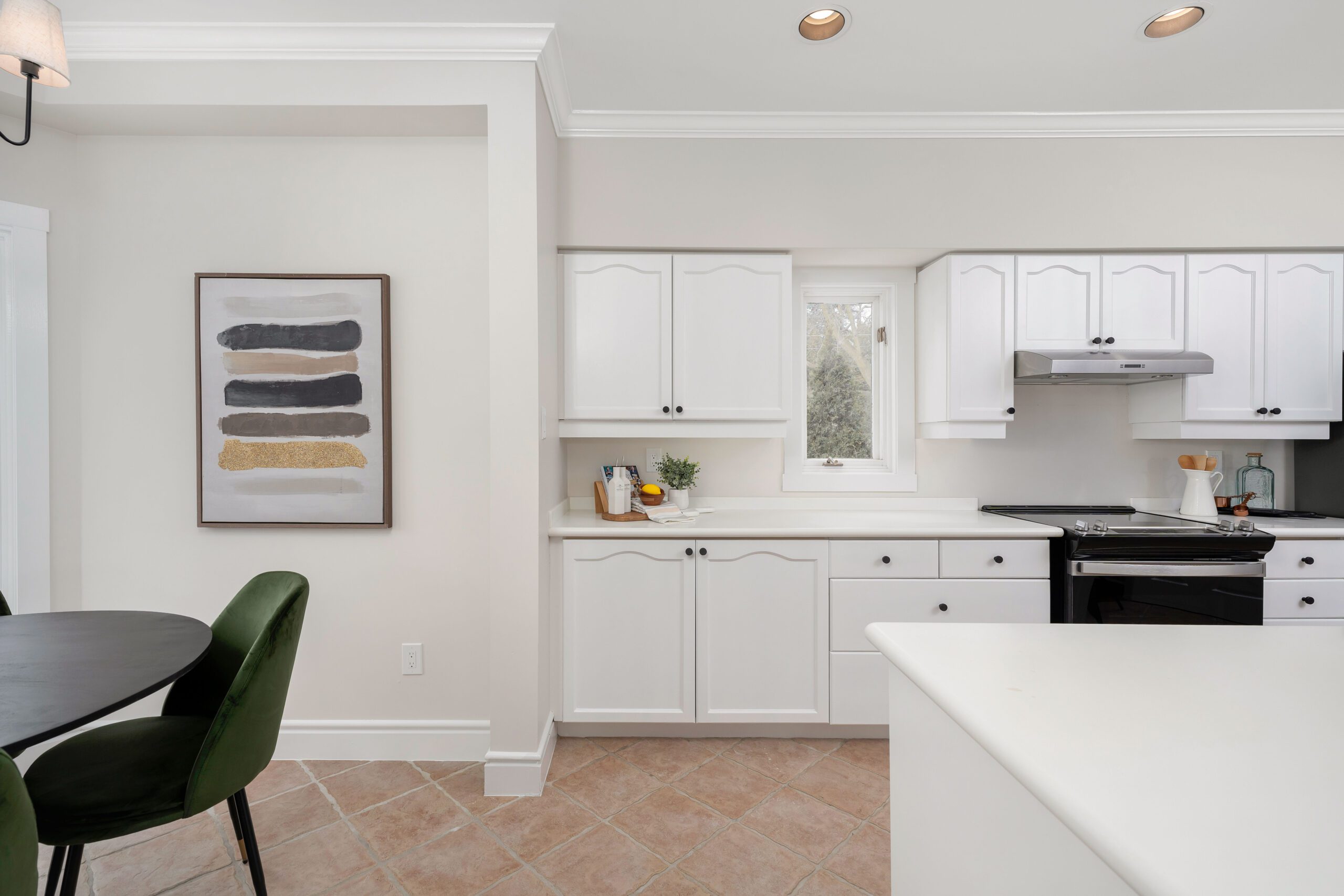 - Spacious eat-in kitchen with professionally refinished white cabinetry, all new matte black hardware and faucet, brand new stainless steel appliances, ample counter space and storage