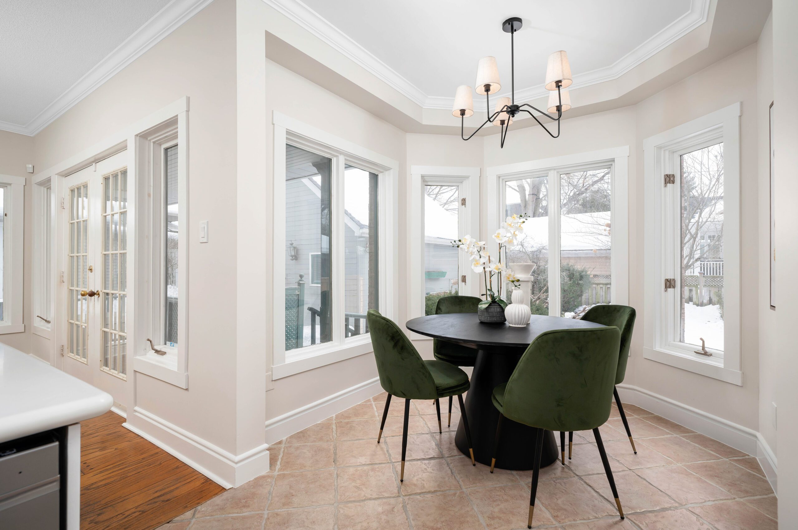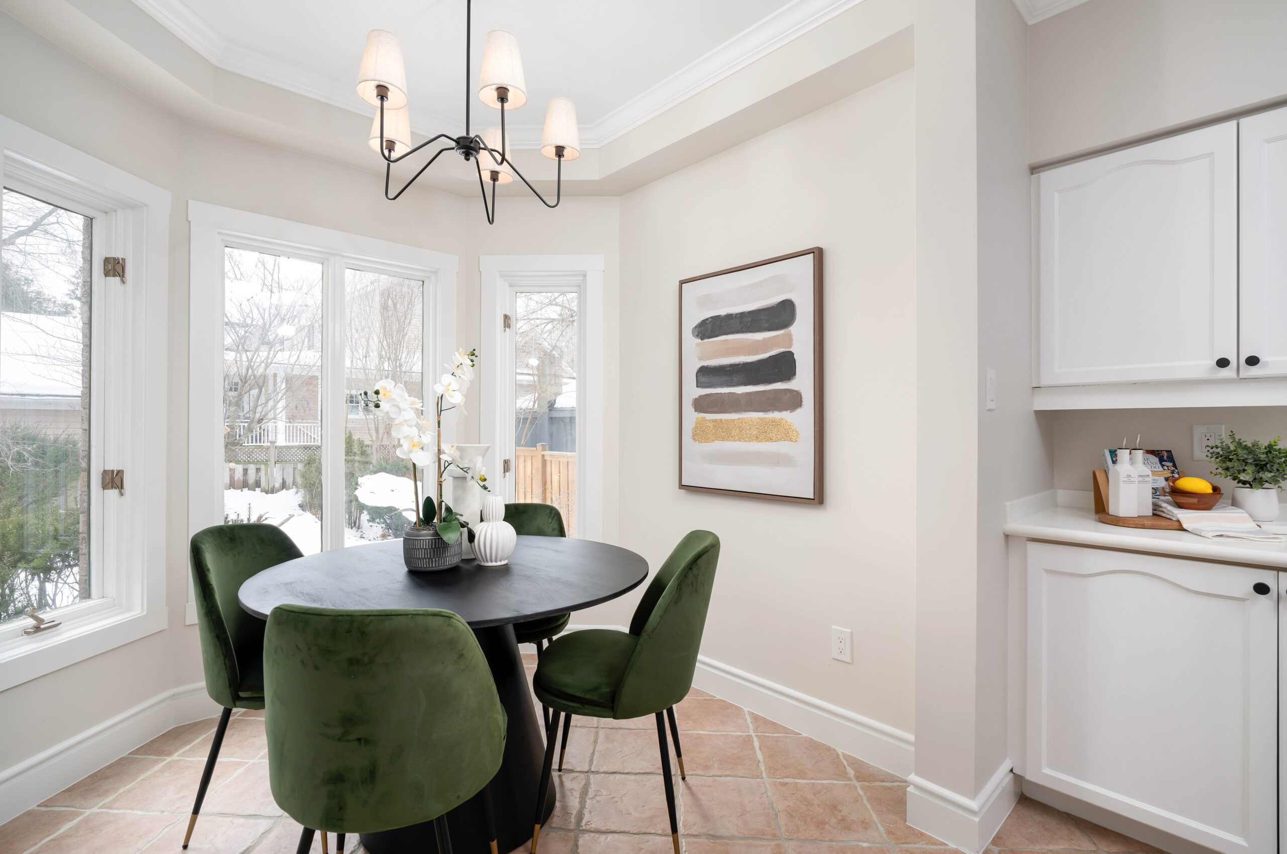 - Cozy breakfast area with decorative chandelier and views of the landscaped rear garden
