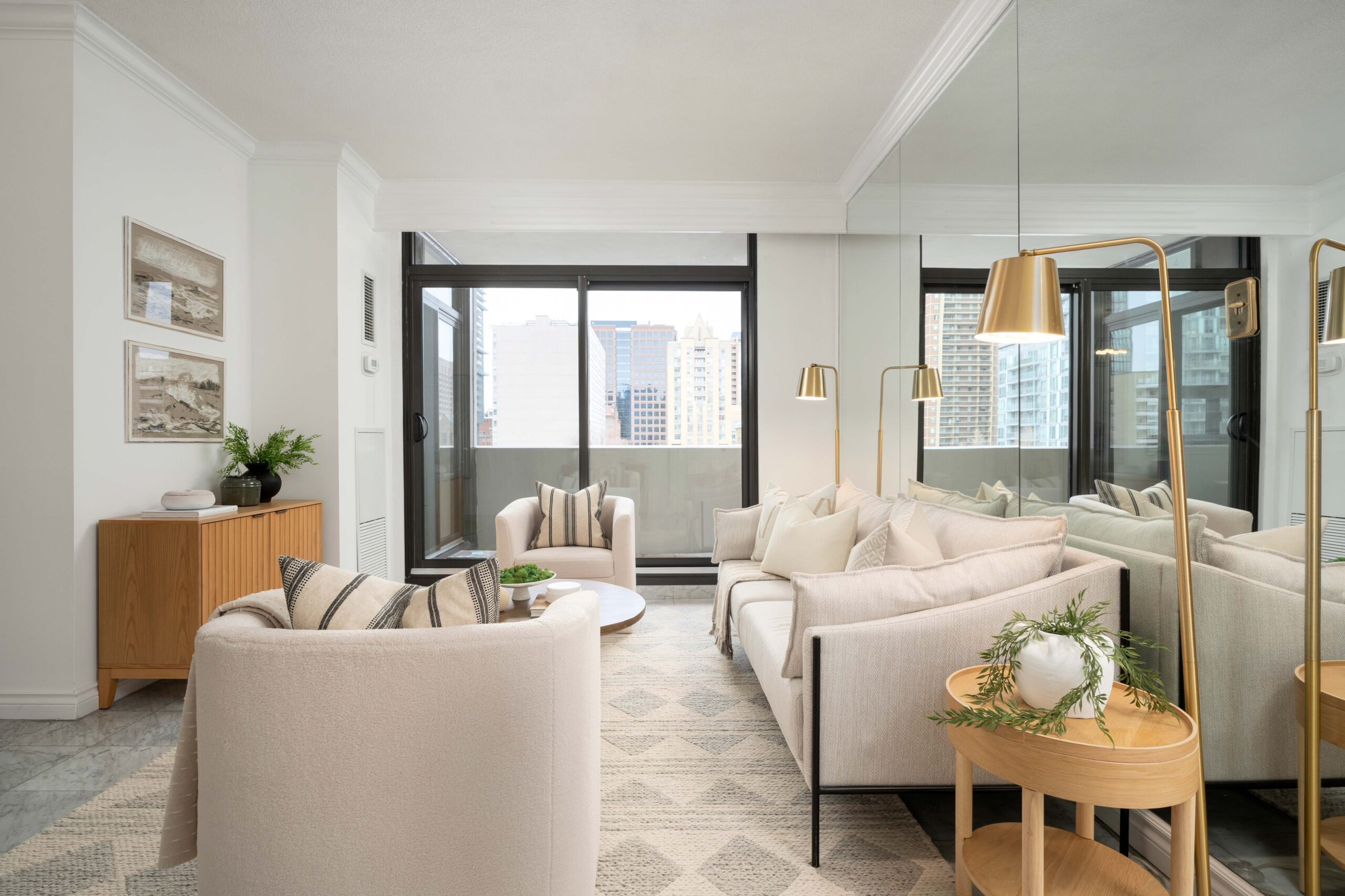 - Mirrored feature wall and new matte black contemporary light fixtures throughout