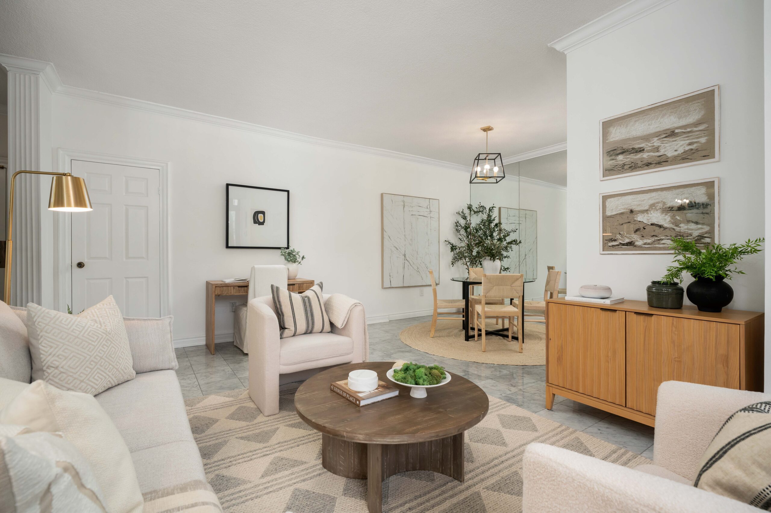 - Bright, open-concept living and dining areas with elegant marble flooring